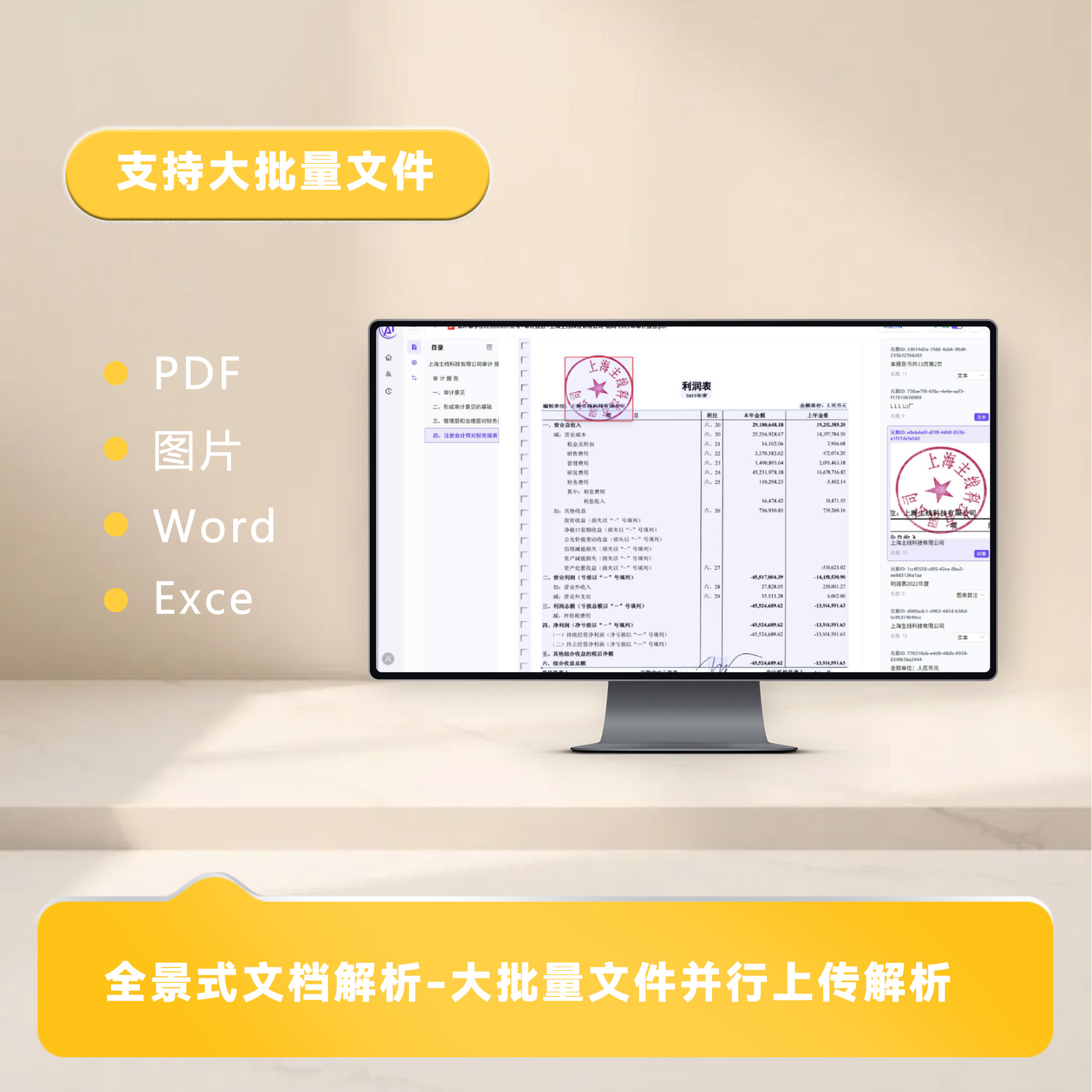 精准识别各类格式文字:扫描件、PDF、照片(发票、合同、名片、手写文字,签名),转化成结构化数据上传数据库。