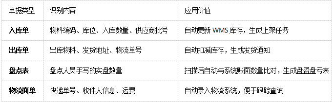 物流单据处理:识别快递面单、发货单上的收件人信息、物品名称、体积重量,自动录入WMS系统,减少人工录入错误。